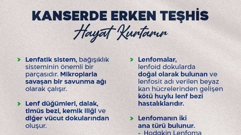 Aksaray İl Sağlık Müdürlüğü, kanserde erken teşhisin önemine dikkat çekerek özellikle lenfoma konusunda farkındalık mesajı yayımladı. Açıklamada, bağışıklık sisteminin önemli bir parçası olan lenfatik sistemin mikroplara karşı vücudu koruyan güçlü bir savunma ağı olduğuna vurgu yapıldı.