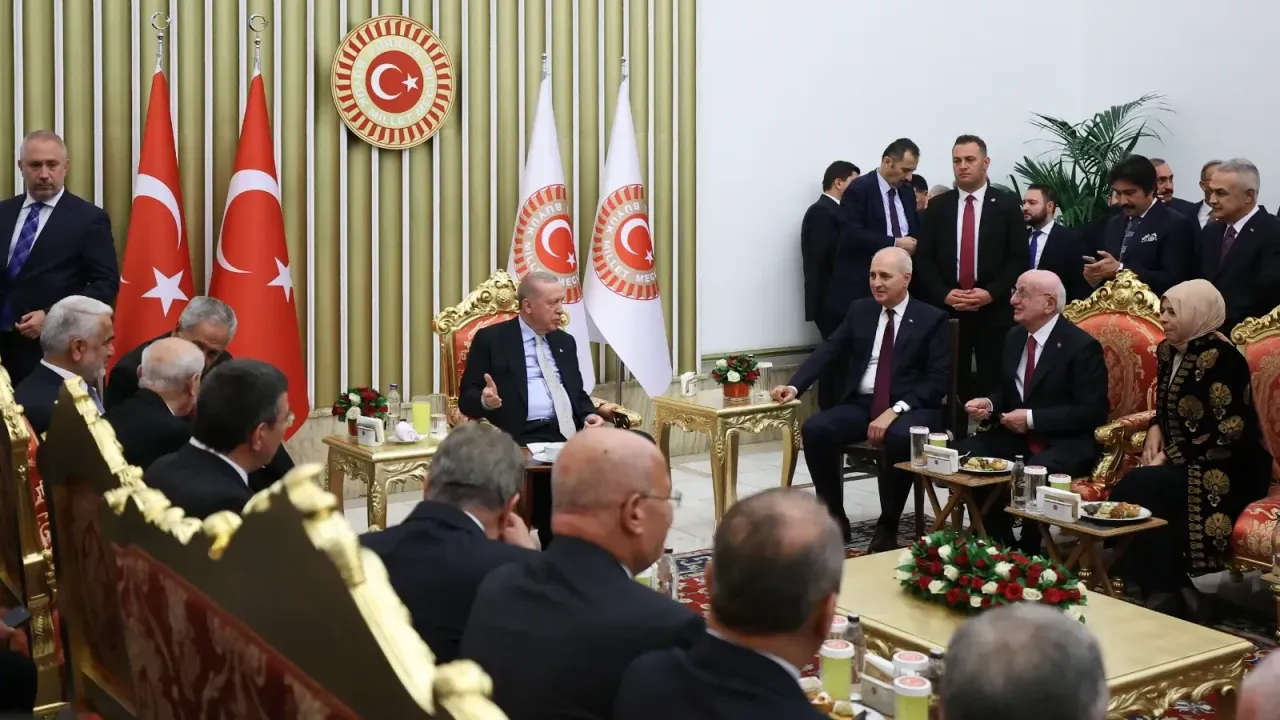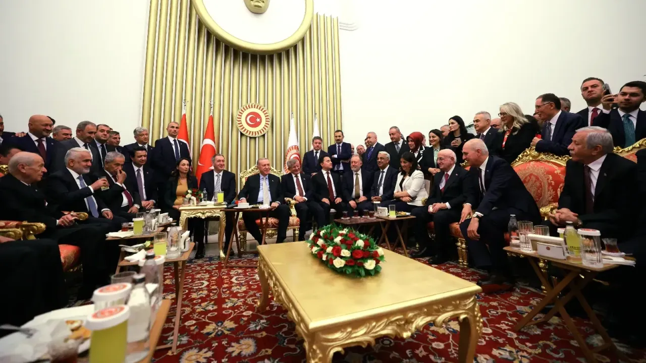 Cumhurbaşkanı Recep Tayyip Erdoğan'ın da katıldığı resepsiyonda siyasi parti liderleri bir araya geldi. Etkinliğe MHP Genel Başkanı Devlet Bahçeli, DEM Parti Eş Genel Başkanları Tülay Hatımoğulları ve Tuncer Bakırhan, TBMM Başkanvekili Celal Adan, Pervin Buldan, DEM Parti Grup Başkanı Mithat Sancar, DEVA Genel Başkanı Ali Babacan, Gelecek Partisi Genel Başkanı Ahmet Davutoğlu, Saadet Partisi Genel Başkanı Mahmut Aslan, HÜDAPAR Genel Başkanı Zekeriya Yapıcıoğlu ve eski TBMM başkanları katıldı.