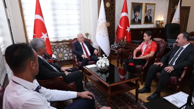 Valilik makamındaki kabulde, Gülistan Gönen'in yanı sıra Milli Eğitim Müdürü Metin Alpaslan, Gençlik ve Spor İl Müdürü Aslan Yıldız, antrenörü Günay Yılmaz ve babası Ramazan Gönen de hazır bulundu.