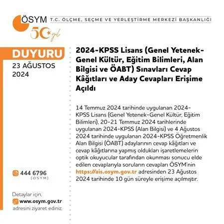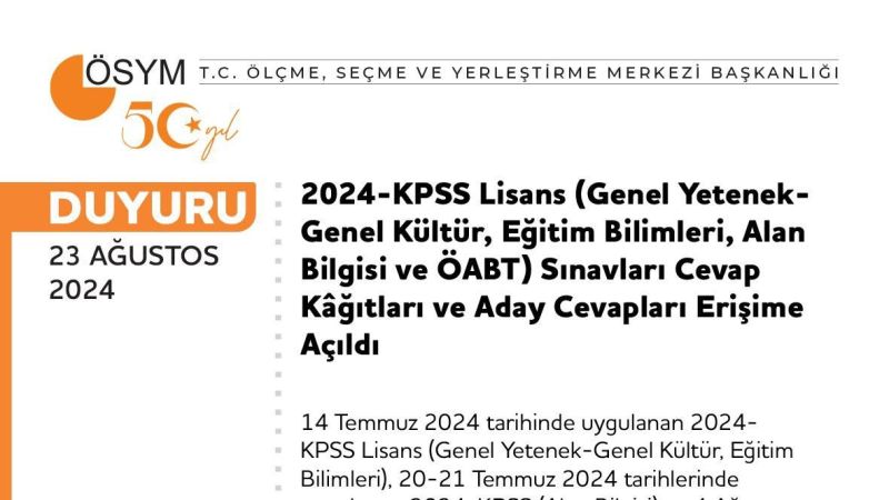 ÖSYM tarafından yapılan açıklamaya göre, 14 Temmuz, 20 ve 21 Temmuz ile 4 Ağustos tarihlerinde gerçekleştirilen KPSS oturumlarına ait değerlendirme süreci tamamlandı. Cevap anahtarları kontrol edildi, itirazlar değerlendirildi ve bazı sorularda değişikliklere gidildi.