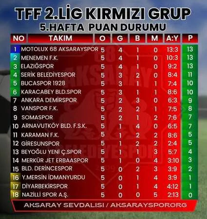 TFF 2.lig Kırmızı grupta ligin ikinci haftasında liderlik koltuğuna oturan siyah beyazlı ekibimiz Motolux 68 Aksarayspor, iki hafta sonra 5. hafta da kendi evinde Nazillisporu 2-0 yenip 13 puanla liderliği tekrar ele geçirdi. Bunun keyfini ve zevkini süren siyah beyazlı ekibimizi önümüzdeki süreçte çok zorlu maçlar bekliyor. Şimdiye kadar hep alt sıralardaki takımlarla karşılaşan Motolux 68 Aksarayspor'un esas gücü bundan sonraki maçlarda ortaya çıkacak. İlk 5 maçta sırasıyla Beyoğlu Yeni Çarşıspor'u 2-0, Yeni Mersin İdmanyurdu'nu 3-1 yenip evinde Karaman FK ,le 1-1 berabere kalmıştı. Daha sonra Belediye Derincespor'u deplasmanda 5-1 yenerek büyük sükse yaptı. Son olarak kendi evinde Nazillispor'u 2-0 yenerek puanını 13' e yükseltip zirvenin yeni sahibi oldu. Şimdi grubumuzun en çok para harcayan ve büyük bütçe ile yeniden kurulan doğunun efsane takımı Vanspor FK ile Cumartesi günü saat 15.00 de karşı karşıya gelinecek. Vanspor FK şimdiye kadar istenilen performansı gösteremese de yine tanınmış futbolculardan oluşan güçlü kadrosuyla tekrar lige ağırlığını koyması tahmin ediliyor. Bizim maçımızda onlar için dönüm maçı olarak gözüküyor. Bizde ilk defa güçlü ve iddialı bir takımla oynayacağız. Bu önemli ve kritik maçın sonucu tüm grup tarafından merakla beklenirken diğer zirveye oynayan takımları da yakından ilgilendiriyor. Bu maçta sonra siyah beyazlı ekibimiz 13 Ekim Pazar günü saat 15.00 de kendi evinde güçlü ve iddialı Elazığspor ile karşılaşacak. Ekibimiz saha ve seyirci avantajını kullanarak bu maçı da kayıpsız geçmek isteyecektir. Daha sonra 20 Ekim Pazar günü saat 19.00 da deplasmanda Menemen FK'nün misafiri olacak. Bu maç belkide grubun en zorlu maçı olacak. Önemli görülen zorlu 4. maç ise 26 Ekim Cumartesi günü saat 19.00 da süper lig tecrübesi olan Giresunspor ile yine deplasmanda oynanacak. İşte bu birbirinden zorlu 4 müsabakayı en az puan kaybı ile atlatmak isteyen Motolux 68 Aksarayspor'un oynayacağı futbol, mücadele ve göstereceği performans herkes tarafından merakla bekleniyor. Öte yandan önümüzde oynayacağımız ilk maç olan Vanspor FK maçının hazırlıklarına dünden itibaren başlayan siyah beyazlı ekibimizde tecrübeli kaptanımız Doğan Ateş'in sakatlığının geçtiği ve bu maçta formasını tekrar alacağı öğrenildi. Sakatlığı süren tecrübeli defans oyuncumuz ve diğer kaptanımız Ercan Yazıcı'nın ise maç saatine kadar durumunun belli olacağı yöneticiler tarafından vurgulandı.