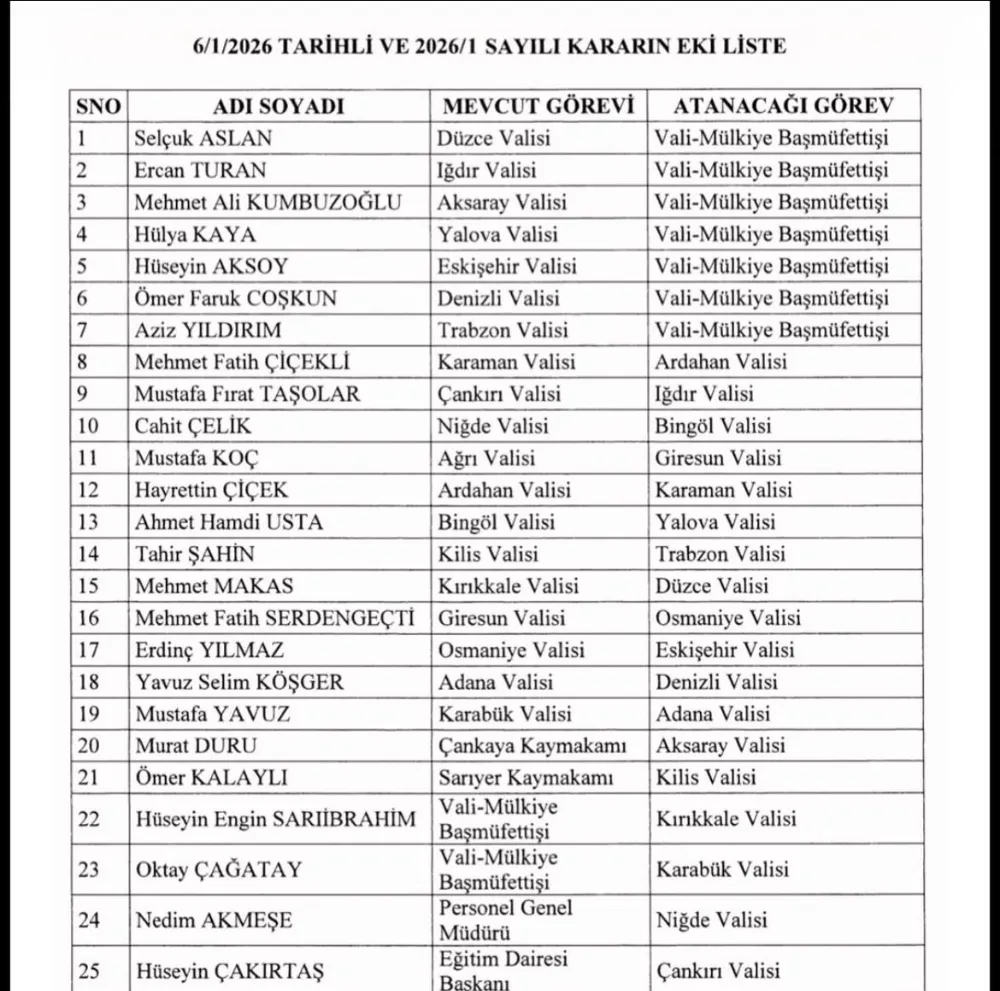 İçişleri Bakanlığı tarafından hazırlanan valiler kararnamesi, Resmi Gazete’de yayımlanarak yürülüğe girdi. Kararnameye göre çok sayıda ilde yeni vali atamaları gerçekleştirildi. Bu kapsamda bazı valiler merkeze çekilirken, bazı isimler farklı illerde görevlendirildi.