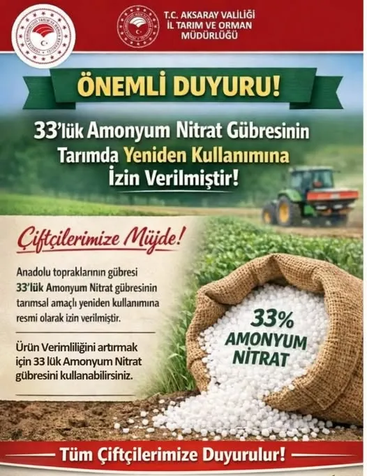 Aksaray İl Tarım ve Orman Müdürlüğü tarafından çiftçilere yönelik önemli bir duyuru yapıldı. %33’lük amonyum nitrat gübresinin tarımsal amaçlı kullanımına yeniden izin verildiği bildirildi.