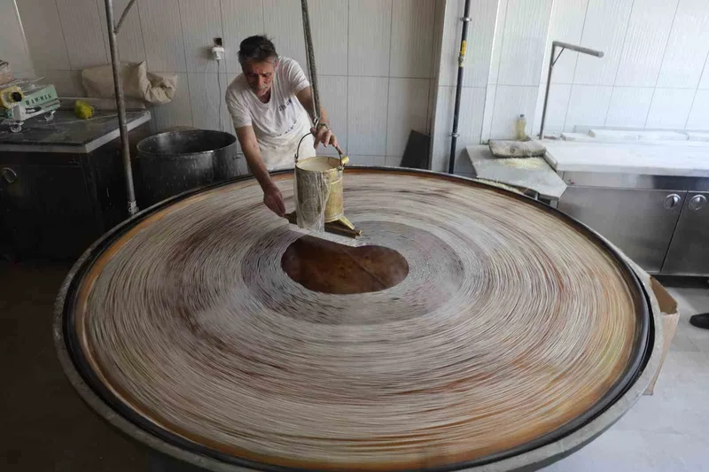 Konya’da Ramazan ayında tatlı üretiminde yoğunluk yaşanırken, geleneksel yöntemlerle el işçiliğiyle bakır tepside hazırlanan tel kadayıf da büyük ilgi görüyor. Üretimde yalnızca un ve su kullanılan tel kadayıfta herhangi bir katkı maddesine yer verilmiyor.