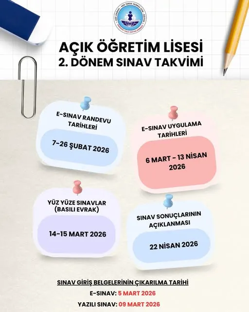 Basılı evrak ile yapılacak yüz yüze sınavlar ise 14-15 Mart 2026 tarihlerinde uygulanacak. Öğrencilerin sınav gün ve saatlerini takip etmeleri önem taşıyor.