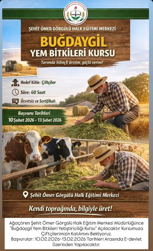 Ağaçören Şehit Ömer Görgülü Halk Eğitimi Merkezi, tarımsal üretimde kaliteyi artırmak ve çiftçilere bilgi temelli destek sunmak amacıyla “Buğdaygil Yem Bitkileri Yetiştiriciliği Kursu” düzenliyor. Yem bitkisi verimini artırmak isteyen üreticilere yönelik planlanan kurs sonunda katılımcılara sertifika verilecek.