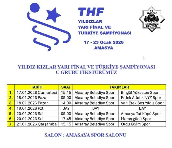 Aksaray Belediyespor Hentbol Yıldız Kız Takımı, 17-23 Ocak 2026 tarihleri arasında Amasya’da düzenlenecek Türkiye Şampiyonası’nda ter dökecek. Türkiye Hentbol Federasyonu tarafından organize edilen bu büyük organizasyonda, yarı final ve final maçları sonucunda şampiyon belli olacak.