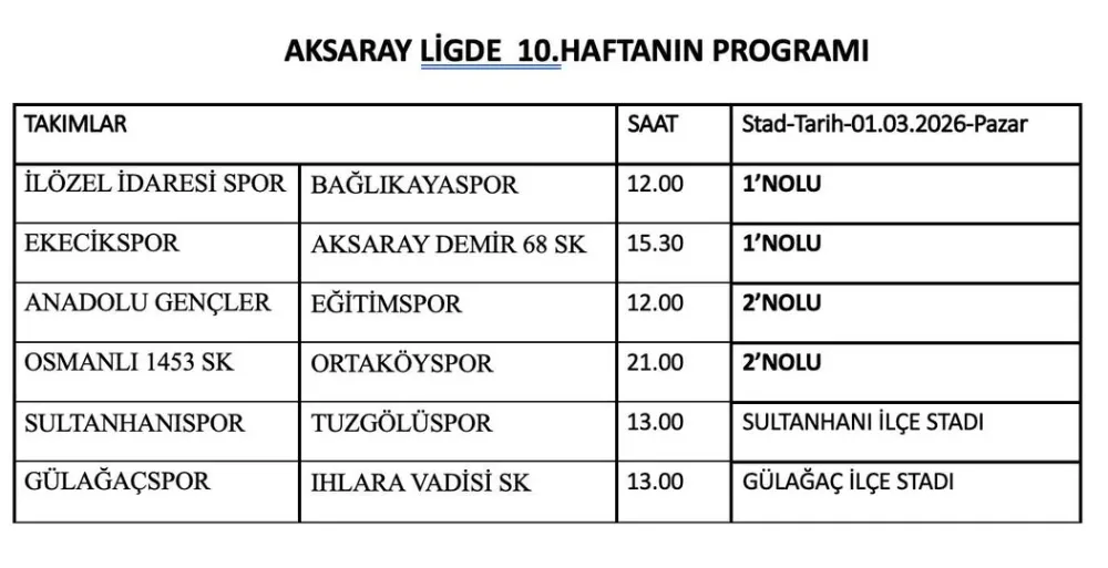 Aksaray Ligi’nde 10. hafta karşılaşmaları 1 Mart 2026 Pazar günü oynanacak. Haftanın programında hem merkez sahalarda hem de ilçe statlarında önemli mücadeleler yer alıyor.