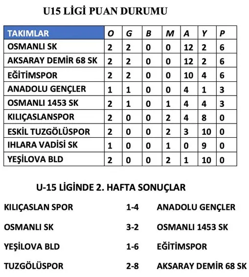 Aksaray U15 Ligi’nde 2. hafta karşılaşmalarının ardından puan tablosu şekillenmeye başladı. Oynanan maçlarla birlikte zirve yarışında dikkat çeken bir tablo ortaya çıktı.