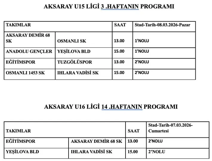 Aksaray U16 Ligi’nde 14. hafta maçları ise 7 Mart 2026 Cumartesi günü oynanacak. Karşılaşmalar 2 Nolu sahada gerçekleştirilecek.