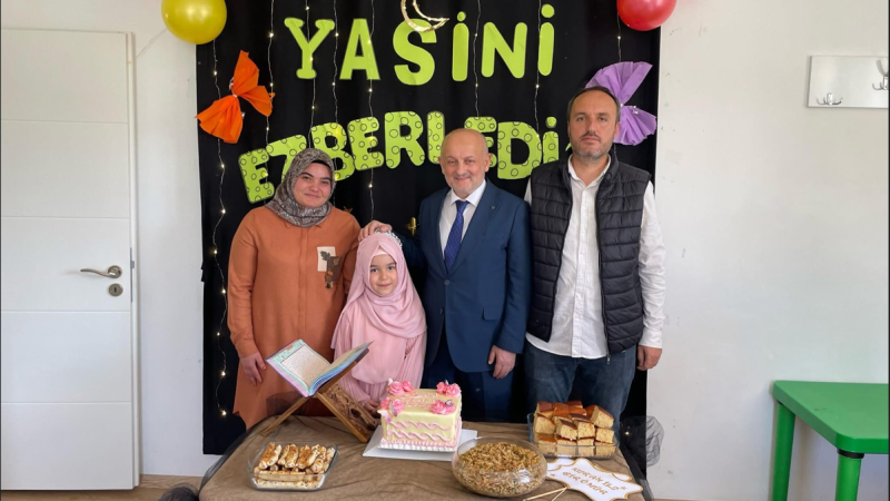Minik Fadime’nin Kur’an’dan bölümler okuması, törene katılanlardan büyük alkış aldı. Ailesi ve öğretmeni Meral Kul’un desteğiyle bu başarıya ulaşan öğrenci, yaşıtlarına ilham verdi.