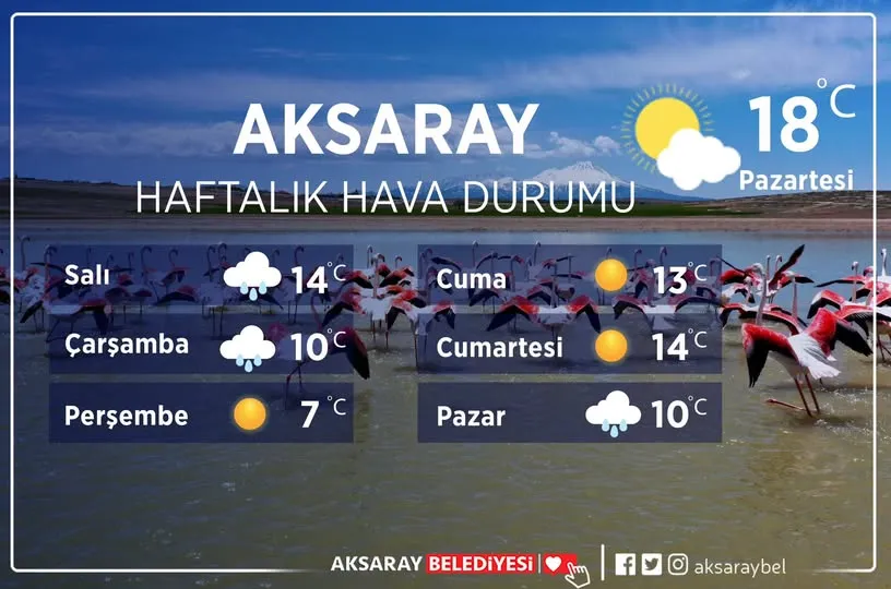 Aksaray Belediyesi, “Günaydın Aksaray” mesajıyla haftaya başladı. Belediye tarafından yapılan paylaşımda, şehirdeki 1 haftalık hava durumu bilgisi kamuoyuyla paylaşıldı.