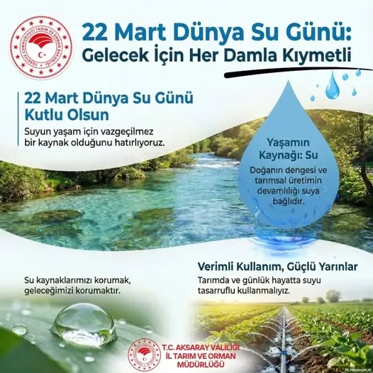 Aksaray İl Tarım ve Orman Müdürlüğü, 22 Mart Dünya Su Günü kapsamında suyun önemine dikkat çekti. Yapılan paylaşımda suyun yaşamın temel kaynağı olduğu vurgulandı.