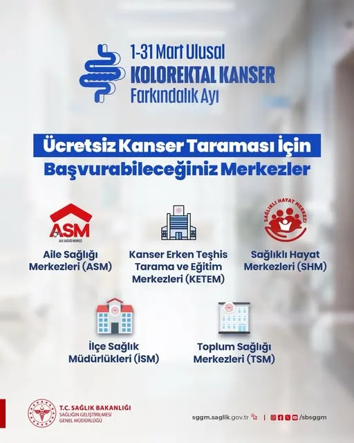 Kolorektal kanserde erken teşhisin hayat kurtardığı vurgulanırken, vatandaşların ücretsiz kanser taramalarından faydalanabileceği belirtildi. Bu hizmetlerin belirli sağlık merkezlerinde sunulduğu ifade edildi.