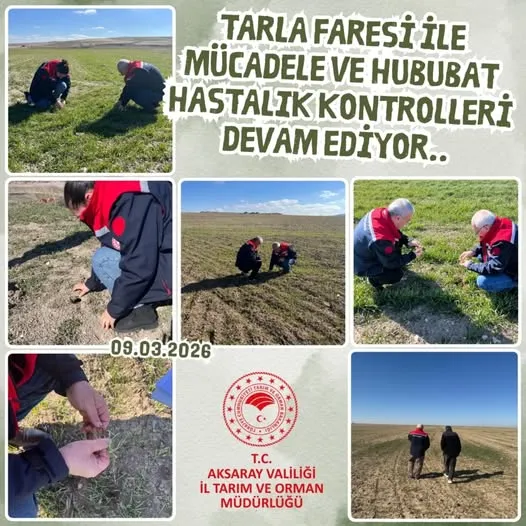 Aksaray İl Tarım ve Orman Müdürlüğü ekipleri tarafından tarım alanlarında kontroller gerçekleştiriliyor. Çalışmalar kapsamında tarla faresi ile mücadele ve hububat hastalıklarına yönelik incelemeler yapılıyor.
