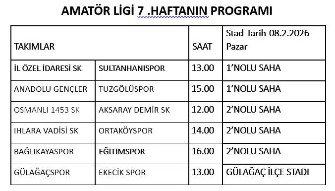Amatör Ligi’nin 7. haftasında futbolseverleri heyecan dolu mücadeleler bekliyor. 08 Şubat 2026 Pazar günü oynanacak karşılaşmaların programı belli oldu. 1 Nolu Saha’da saat 13.00’te İl Özel İdaresi SK, Sultanhanspor ile karşı karşıya gelecek.