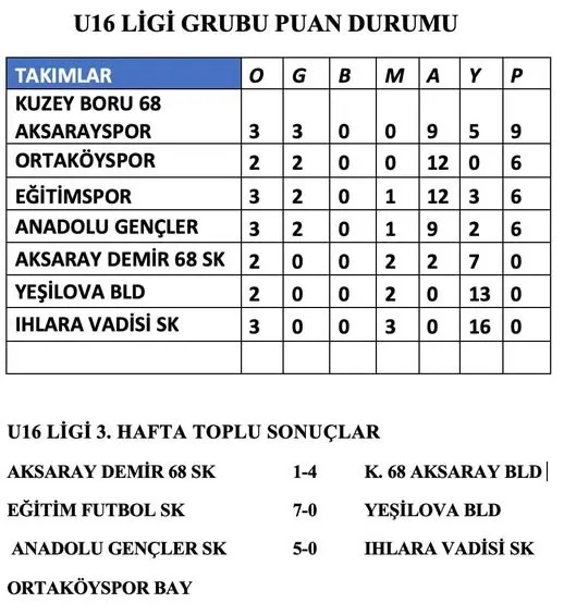 Aksaray U16 Futbol Ligi 3. hafta karşılaşmasında Anadolu Gençler, Ihlara Vadisi SK karşısında etkileyici bir performans sergileyerek sahadan 5-0’lık net bir galibiyetle ayrıldı. Maç boyunca oyun üstünlüğünü elinde tutan Anadolu Gençler, savunmada ve hücumda dengeli bir futbol ortaya koydu.