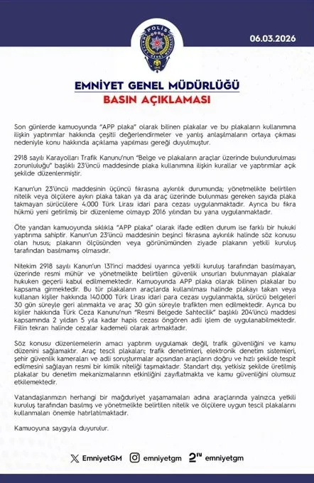 Emniyet Genel Müdürlüğü (EGM), 'APP plaka' olarak bilinen plakalara ilişkin önemli bir açıklama yaptı. Yetkili kuruluş tarafından basılmayan, üzerinde resmi mühür ve yönetmelikte belirtilen güvenlik unsurları bulunmayan plakaların hukuken geçerli kabul edilmediği vurgulandı. Kamuoyunda APP plaka olarak bilinen plakaların bu kapsama girdiği belirtildi.