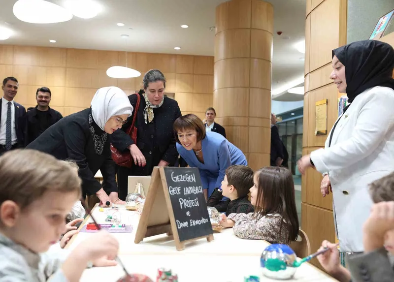 Emine Erdoğan ve Charlotte Merz, Nasreddin Hoca Çocuk Kütüphanesi'ne geçerek burada çeşitli etkinlikler yapan çocuklarla bir araya geldi. Çocukların, "kodlama" dersi kapsamında yaptıkları basit elektrik devresi çalışmalarını ve gezegen şeklindeki gece lambası tasarımlarını inceleyen lider eşleri, çocuklarla etkinliklerine ilişkin sohbet etti.