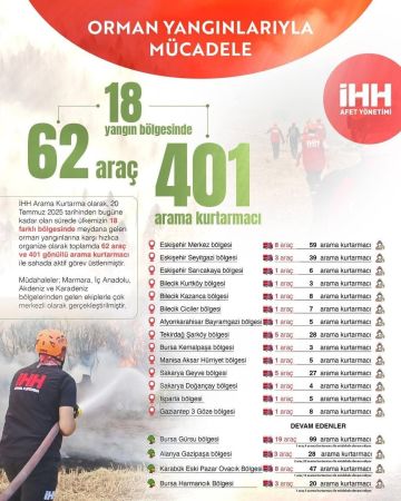 Tekirdağ Şarköy (5 araç, 28 gönüllü), Sakarya Geyve (5 araç, 27 gönüllü), Karabük Eski Pazar-Ovacık (8 araç, 47 gönüllü) gibi bölgelerde yüksek katılımla sahada bulunan İHH ekipleri, yangınla mücadelede koordineli hareket ederek hızlı sonuçlar aldı.
