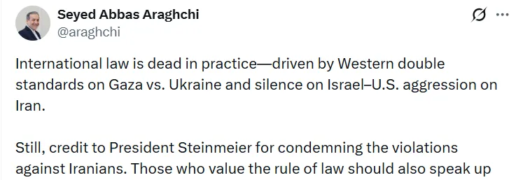 Arakçi, Almanya Cumhurbaşkanı Frank-Walter Steinmeier'in ABD ve İsrail'in İran'a yönelik saldırılarını ve Almanya hükümetinin tutumunu eleştiren sözlerini hatırlattı. "Yine de, İranlılara yönelik ihlalleri kınadığı için Cumhurbaşkanı Steinmeier'i takdir etmek gerekir" ifadesini kullandı ve hukukun üstünlüğüne değer veren herkesi yaşananlara karşı sesini yükseltmeye çağırdı.