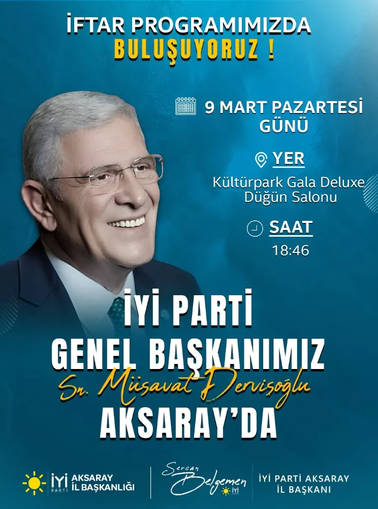 İYİ Parti Genel Başkanı Müsavat Dervişoğlu, Aksaray’da düzenlenecek iftar programında vatandaşlarla bir araya gelecek. Ramazan ayı kapsamında gerçekleştirilecek programda partililer ve vatandaşlar aynı sofrada buluşacak.
