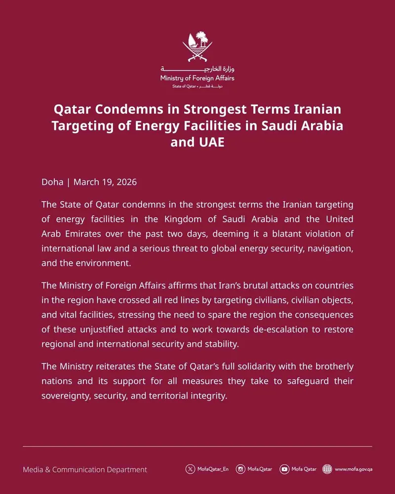 Katar Dışişleri Bakanlığı, İran’ın Suudi Arabistan ve Birleşik Arap Emirlikleri’ndeki (BAE) enerji tesislerine yönelik saldırılarını şiddetle kınadı. Yapılan açıklamada, Tahran'ın bu hamlesinin "uluslararası hukukun açık bir ihlali" olduğu ve küresel enerji güvenliği için ciddi bir tehdit oluşturduğu vurgulandı.