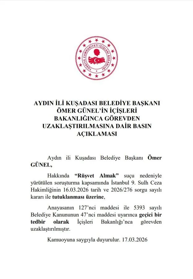 İçişleri Bakanlığı, Aydın'ın Kuşadası ilçesinin Belediye Başkanı Ömer Günel'in görevden uzaklaştırıldığını resmen duyurdu. Yapılan açıklamada, bu kararın geçici bir tedbir olarak alındığı belirtildi.