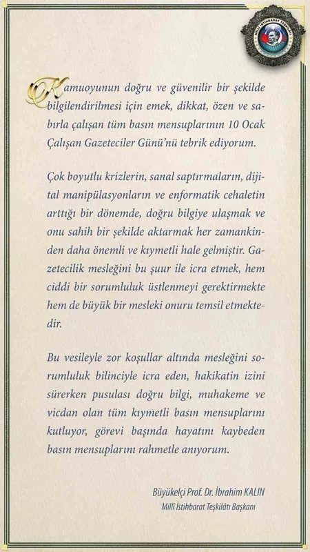 MİT Başkanı İbrahim Kalın, kamuoyunun doğru ve güvenilir bir şekilde bilgilendirilmesi için emek, dikkat, özen ve sabırla çalışan tüm basın mensuplarının 10 Ocak Çalışan Gazeteciler Günü’nü tebrik etti.
