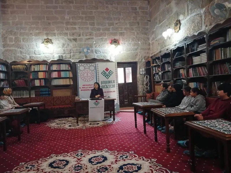 Aksaray’da İl Milli Eğitim Müdürlüğü Anadolu Mektebi İl Koordinatörlüğü tarafından yürütülen yazar okumaları programı çerçevesinde ortaokul ve lise öğrencileri okuma sohbetlerinde bir araya geldi.