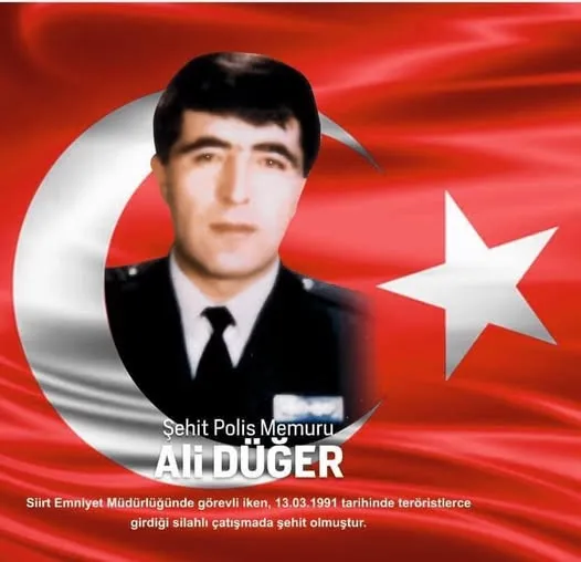 Şehit Polis Memuru Ali Düğer, 13 Mart 1991 tarihinde Siirt’te BTÖ mensubu teröristlerle girilen silahlı çatışma sonucu şehit oldu. Görevini yerine getirirken hayatını kaybeden Düğer, vatan uğruna can veren kahramanlar arasında yer aldı.