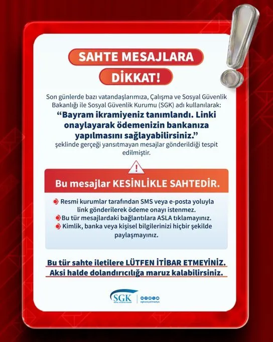 SGK, vatandaşlara gelen 'bayram ikramiyesi' mesajlarının sahte olduğunu duyurdu ve linklere tıklanmamasını istedi.