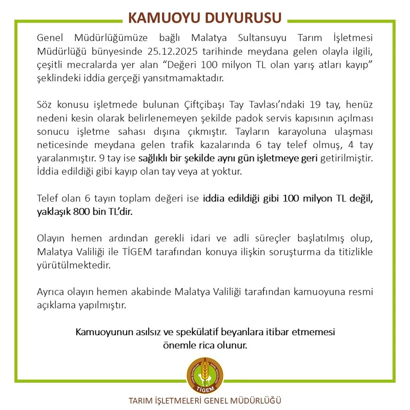 TİGEM, kayıp tay veya at olmadığını vurguladı. Telef olan 6 tayın toplam değerinin iddia edildiği gibi 100 milyon TL değil, yaklaşık 800 bin TL olduğu bildirildi. Olayın hemen ardından gerekli idari ve adli süreçler başlatıldı, Malatya Valiliği ile TİGEM tarafından soruşturma titizlikle yürütülüyor.