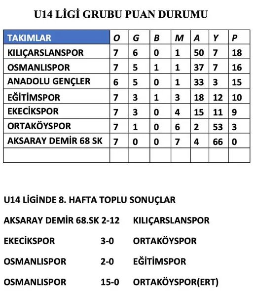 U14 Ligi’nin 8. haftasında oynanan karşılaşmalar, hem bol gollü skorlar hem de sıralamadaki değişikliklerle dikkat çekti. Kılıçarslanspor, Aksaray Demir 68 SK karşısında aldığı 12-2’lik galibiyetle puanını 18'e yükselterek zirvedeki yerini korudu. Gol yollarındaki etkili performansı, liderlik yarışındaki iddiasını bir kez daha ortaya koydu.