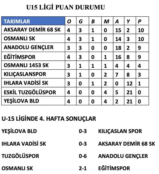 Aksaray Amatör Spor Kulüpleri Federasyonu tarafından düzenlenen U15 Ligi’nde 4. hafta karşılaşmaları tamamlandı. Oynanan maçların ardından ligde üst sıralardaki rekabet daha da arttı.