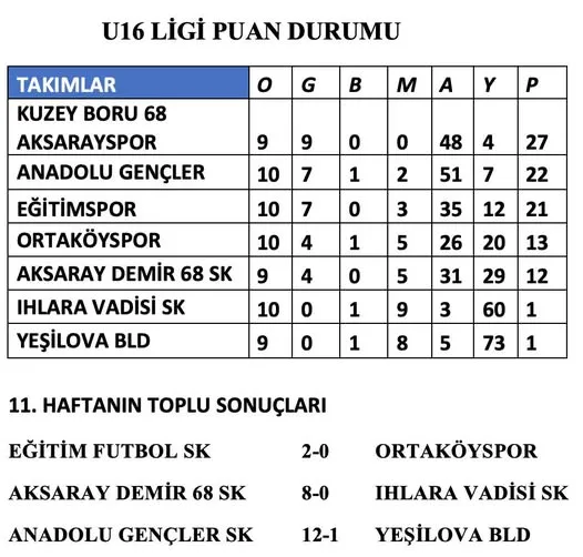 Aksaray Amatör Spor Kulüpleri Federasyonu tarafından düzenlenen U16 Ligi’nde 11. hafta itibarıyla puan tablosu şekillendi. Oynanan karşılaşmaların ardından zirve yarışında önemli gelişmeler yaşandı.