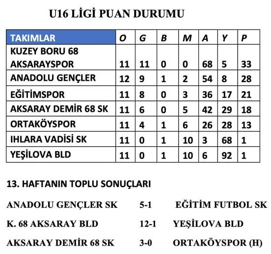 Aksaray Amatör Spor Kulüpleri Federasyonu bünyesinde oynanan U16 Ligi’nde 13. hafta sonunda liderlik koltuğunda Kuzey Boru 68 Aksarayspor yer aldı. 11 maçta 11 galibiyet elde eden ekip, 68 attığı gole karşılık sadece 5 gol yiyerek 33 puanla zirvede bulunuyor.