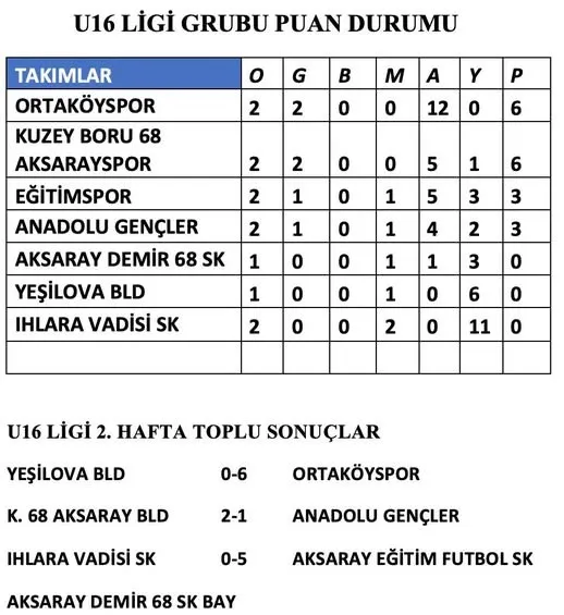 Aksaray U16 Ligi’nde ikinci hafta heyecanı sona erdi. Haftanın en dikkat çeken skorlarından biri, Ortaköyspor’un Yeşilova Belediyespor’u 6-0 mağlup etmesi oldu. Bu farklı galibiyetle Ortaköyspor, 2 maçta 12 gol atarak averajla liderliğini sürdürdü.