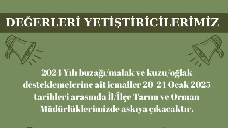 Aksaray İl Tarım ve Orman Müdürlüğü tarafından yapılan açıklamada, “2024 yılı birinci dönem buzağı/malak ve kuzu/oğlak desteklemelerine ait icmaller, 20-24 Ocak 2025 tarihleri arasında İl/İlçe Tarım ve Orman Müdürlüklerinde askıya çıkarılacaktır. Destekleme bilgilerinizi kontrol etmeyi ihmal etmeyin ve varsa hataları düzeltmek için yetkililere başvurun” denildi.