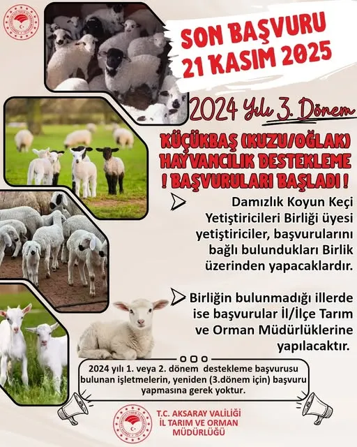 Aksaray İl Tarım ve Orman Müdürlüğü, 2024 yılı 3. dönem küçükbaş hayvan destekleme programı kapsamında başvuruların başladığını duyurdu. Program, kuzu ve oğlak yetiştiriciliği yapan üreticilere mali destek sunarak sektörün gelişmesini hedefliyor.