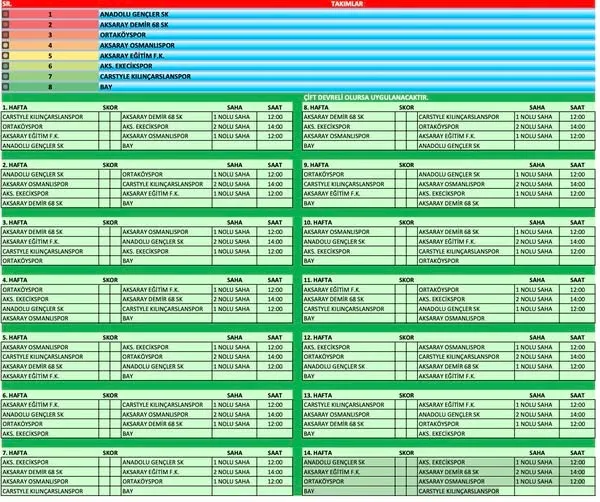 Ligin ilk haftasında Anadolu Gençler SK ile Aksaray Demir 68 SK, Ortaköyspor ile Aks. Ekesgücü ve Aksaray Eğitim SK ile Aksaray Osmanspor karşı karşıya gelecek. Maçlar 1 ve 2 Nolu sahalarda oynanacak ve saat 12.00’de başlayacak.