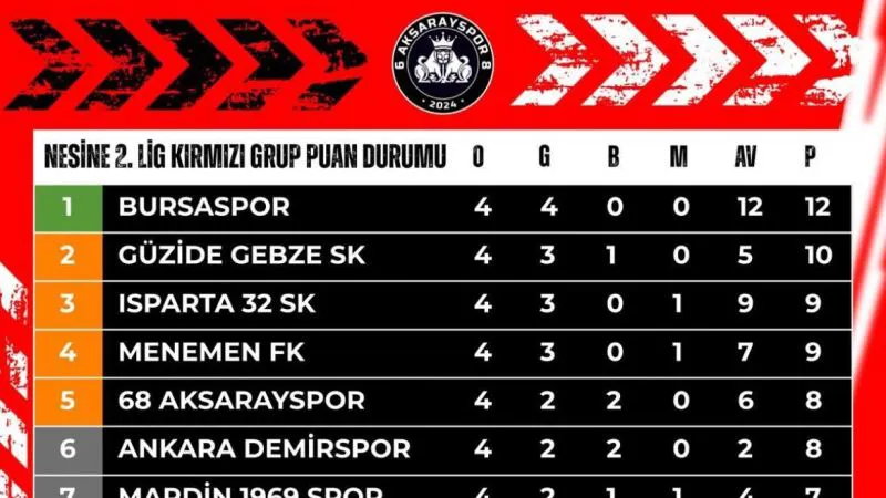 Nesine 2. Lig Kırmızı Grup’ta 4. hafta karşılaşmaları sona erdi. Takımların aldığı sonuçlarla birlikte puan durumu da şekillenirken, 68 Aksarayspor ilk 5 içinde yer aldı.