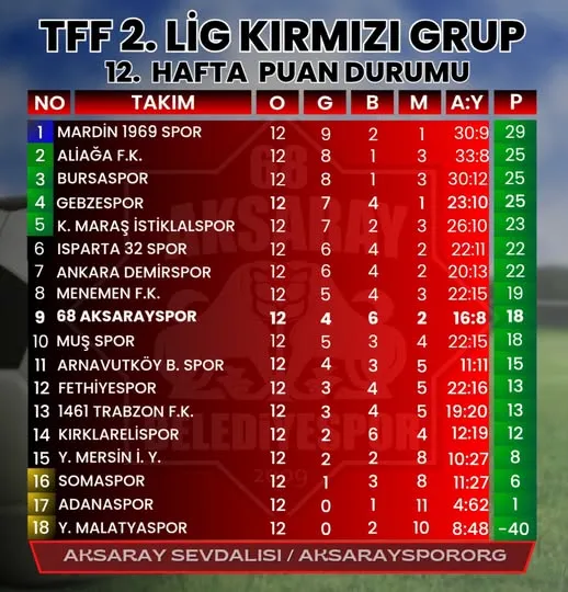 Ligin ortalarına gelinirken, zirve yarışı kadar alt sıralardaki mücadele de dikkat çekiyor. 68 Aksarayspor, bu haftayı aldığı sonuçla 9. sırada tamamladı.