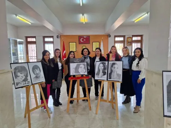 Sergide 2015 yılında vahşice katledilen Özgecan Aslan’ın portresi dikkat çekti. Grafik ve fotoğraf alanı öğretmeni Betül Yılmaz, “Öncelikle basitten portre çizimleri ile başlamıştık derslerimize. Sonrasında önümüzde özel bir gün vardı 8 Mart Dünya Kadınlar günü ve bunu daha iyi vurgulayabilmek için Özgecan Aslanı düşündük. Kadına şiddet olsun onun dışında yaşanan zorluklar olsun birçok alanda olumsuzlukları kadınlar yaşıyor. Bu konulara dikkat çekmek adına Kadınlar Gününe özel hem afiş sergisi yaptık hem de portrelerle birlikte karakalem tekniği ile böyle bir sergi açtık bir farkındalık olması amacı ile” diye konuştu.