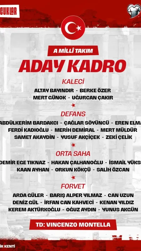 A Milli Futbol Takımı, 2026 FIFA Dünya Kupası Elemeleri kapsamında oynayacağı Gürcistan ve İspanya maçları için hazırlıklara başlıyor. Türkiye Futbol Federasyonu, Ay-Yıldızlı ekibin 28 kişilik aday kadrosunu kamuoyuyla paylaştı.