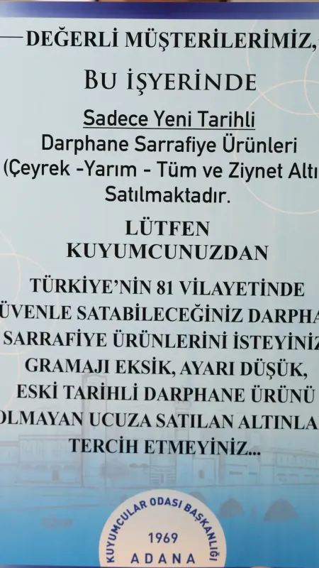 Adana’da sahte ve düşük ayarlı altınların yaygınlaşmasının ardından Adana Kuyumcular Odası harekete geçti. Alınan kararla birlikte kentteki kuyumcular artık yalnızca 2025 tarihli, darphane üretimi gram, çeyrek, yarım ve tam altınları satabilecek. Kuyumcu dükkânlarının vitrinlerine ise “Bu iş yerinde sadece yeni tarihli darphane sarrafiye ürünleri satılmaktadır” yazılı dövizler asıldı.