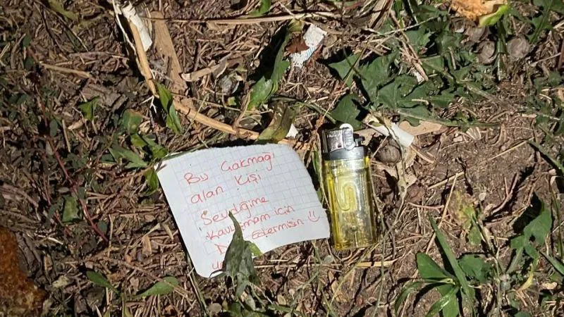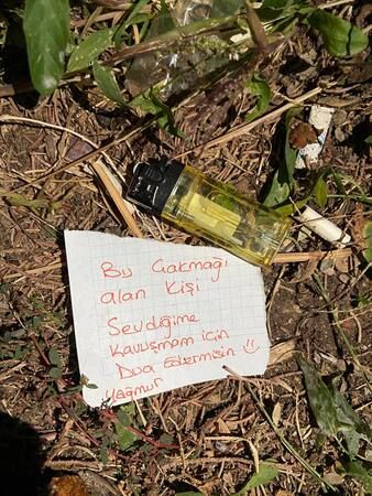 Sevdiğine kavuşamayan Yağmur isimli kadın, “Bu çakmağı alan kişi sevdiğime kavuşmam için dua eder misin? Yağmur” notuyla çakmağı ağaç altına bıraktı.