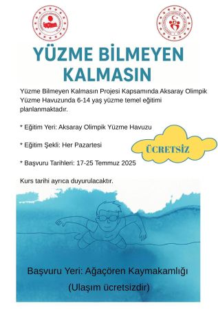 Yüzme eğitimleri, profesyonel eğitmenler eşliğinde, sporcu sağlığı ve güvenliği esas alınarak Aksaray Olimpik Yüzme Havuzu’nda verilecek. Katılımcı çocuklar için ulaşım tamamen ücretsiz olarak sağlanacak. Kursa katılmak isteyen veliler, başvurularını 17-25 Temmuz 2025 tarihleri arasında Ağaçören Kaymakamlığı’na yapabilecek. Kurs tarihleri ise ilerleyen günlerde ayrıca duyurulacak.