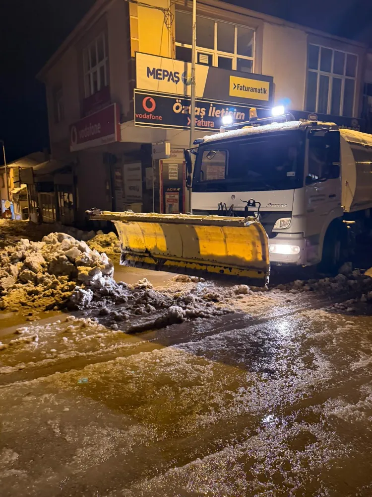 Özellikle çarşı merkezi başta olmak üzere vatandaşların yoğun olarak kullandığı alanlarda kar küreme ve tuzlama çalışmaları aralıksız sürdürülüyor.