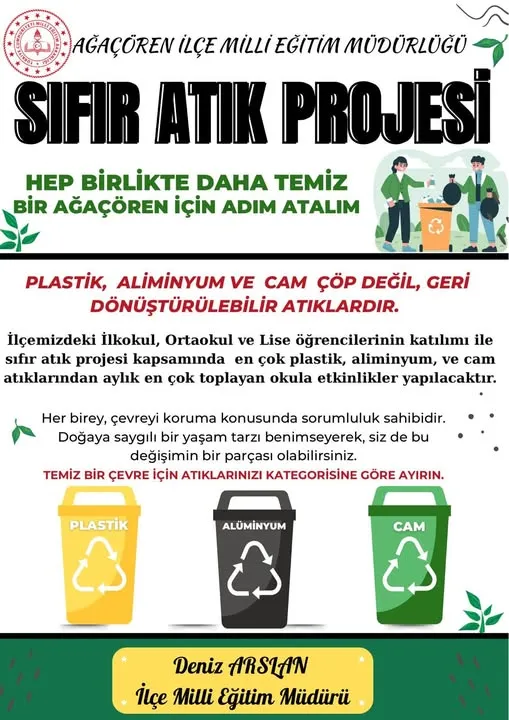 Ağaçören İlçe Millî Eğitim Müdürlüğü, öğrencilerde çevre bilinci oluşturmak ve sürdürülebilir bir yaşam tarzını teşvik etmek amacıyla “Sıfır Atık Projesi”ni hayata geçirdi. İlçede başlatılan bu projeyle birlikte her yaştan öğrenci geri dönüşüm konusunda aktif rol alacak.